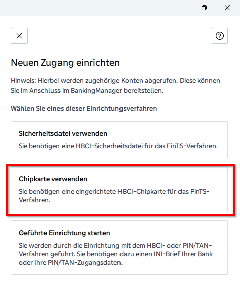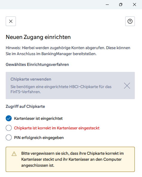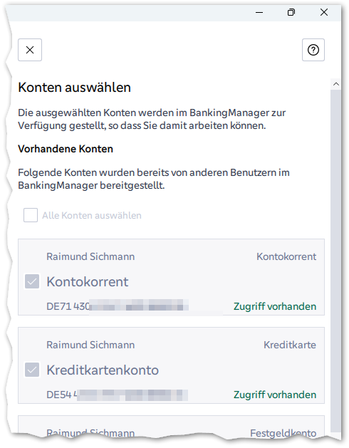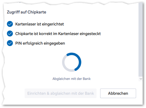 Den „Zugang synchronisieren“ sollten Sie anwählen, wenn am Konto neue Funktionen oder neue Rechte freigeschaltet wurden. Beachten Sie, dass je nach Bank und Auslastung etwas Zeit vergehen muss, bis die Bankserver auf Änderungen reagiert haben.