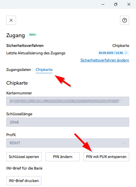 In der Kontenliste (ggf. müssen Sie die Rechte von einem Admin bekommen) können Sie das verwendete Sicherheitsmedium anwählen, sofern dieses für das Konto auch nutzbar ist. Synchronisieren Sie ggf. Ihren Zugang, wie oben angegeben.