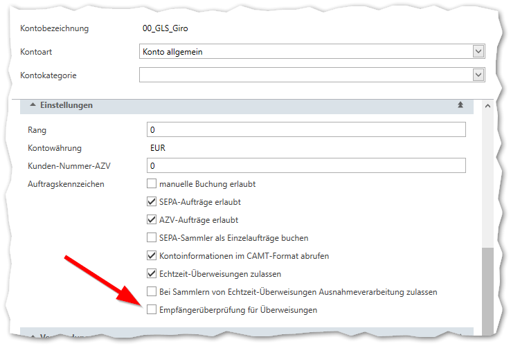 Die Empfängerüberprüfung für Überweisungen kann für das Konto deaktiviert werden.