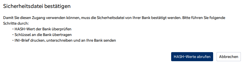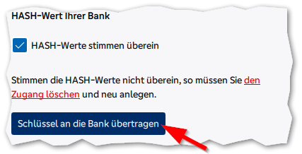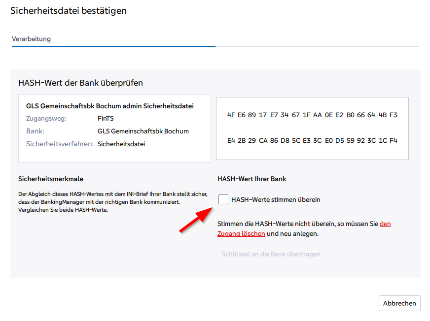 Im nächsten Schritt wird der Bankschlüssel abgerufen und der Hashwert (eine Art Fingerabdruck) wird ausgerechnet und Ihnen zur Prüfung angezeigt.