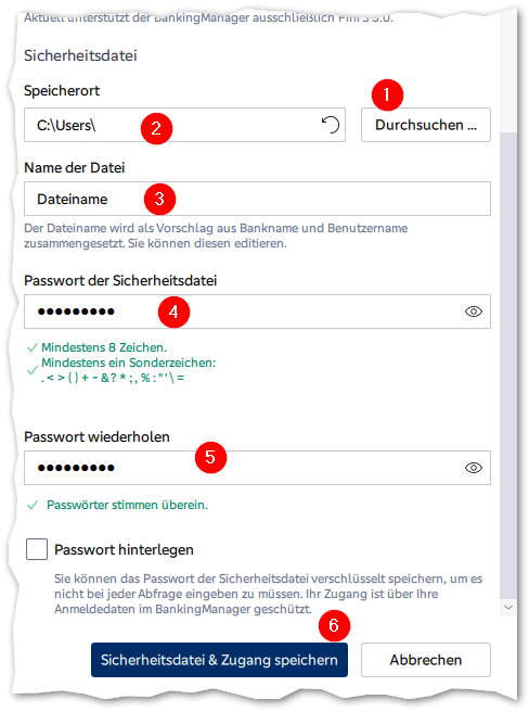 Sie können auch den Pfad eintippen (2) und den Dateinamen angeben (3). Mein Vorschlag: Bankname-Benutzer, also z.B. GLS-Raimund.
