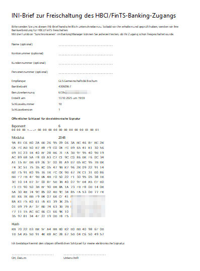 Diesen Ini-Brief müssen Sie ausdrucken und ausgefüllt und unterschrieben an die Bank senden. Bitte fügen Sie nicht einfach eine gescannte Unterschrift ein. Die Bank wird Ihre Unterschrift intensiv prüfen und muss den Hashwert abtippen.