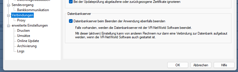 Schalten Sie in der VR-NetWorld Software unter „Extras“, „Einstellungen bearbeiten“ das Beenden des Datenbankservers aus. Hier im Screenshot ist es noch aktiv.