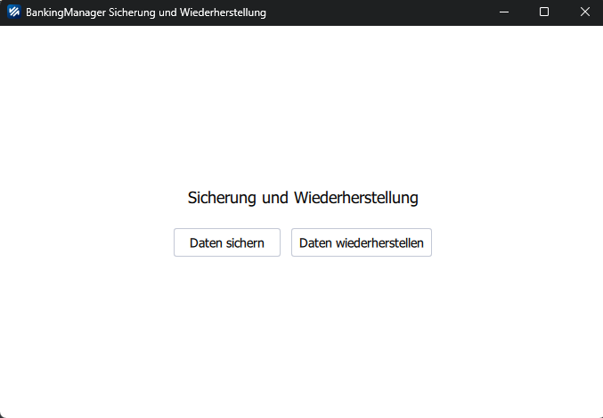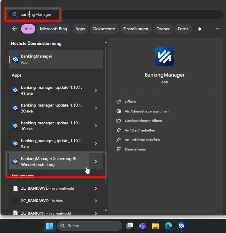 Suchen Sie in Windows über die Programmsuche nach „banking“ und wählen Sie „BankingManager Sicherung & Wiederherstellung“ aus.