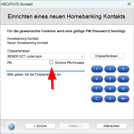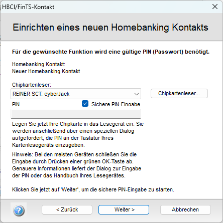 Stecken Sie die richtige Karte ein und klicken Sie dann auf weiter (die Karte mit FinTS-Aufdruck und ohne Magnetstreifen):