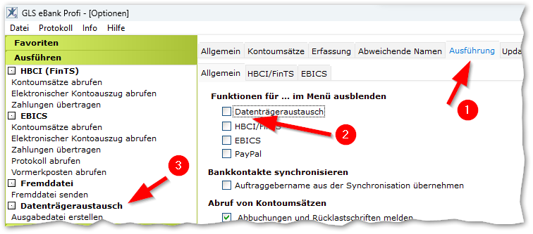 Klicken Sie auf die Karteikarte „Ausführung“, dann entfernen Sie dort oben den Haken bei Datenträgeraustausch. (2)