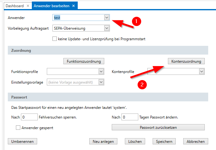 Wenn neue Konten fehlen, kann es sein, dass für den Anwender neue Konten in der Anwenderverwaltung nicht zugeordnet sind.