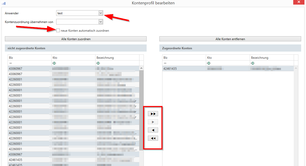 Links stehen die Konten, die der User nicht sehen/nutzen kann, rechts die „erlaubten“. Dies ist eine Profi cash Einstellung – sie ist unabhängig von den in der Bank geschalteten Berechtigungen.