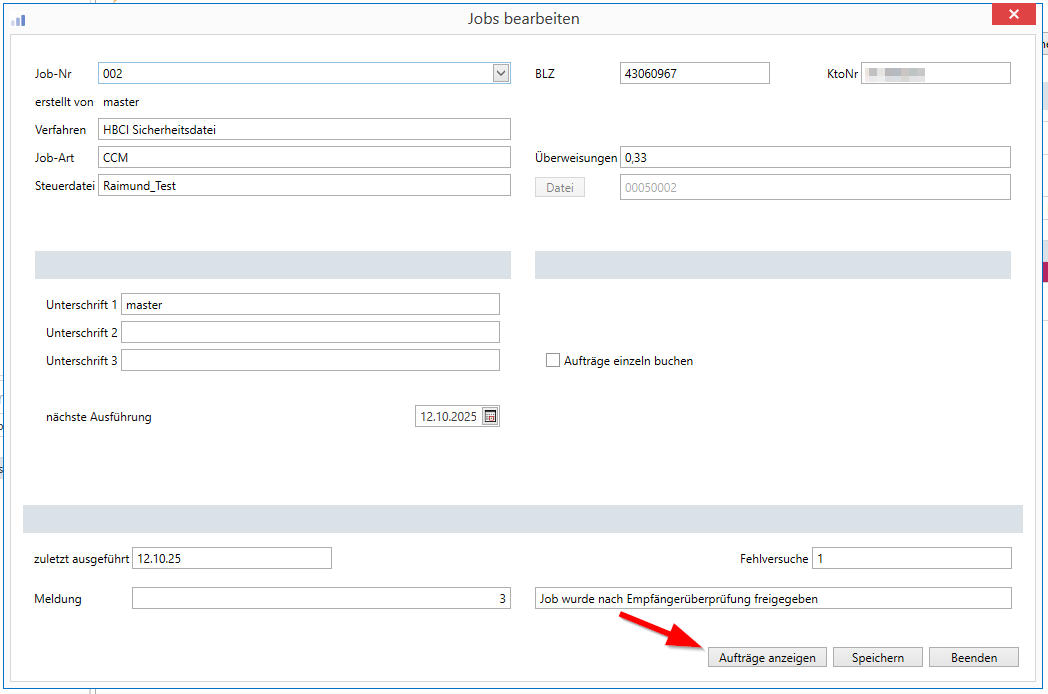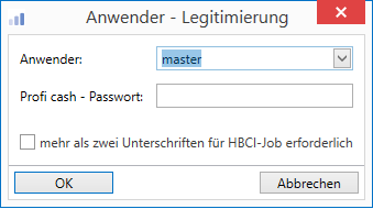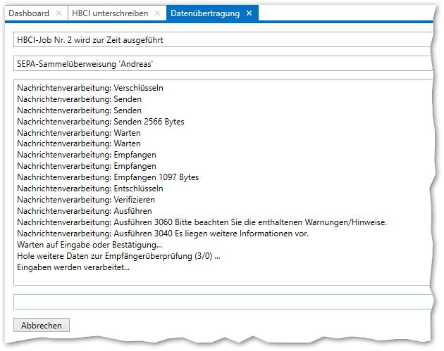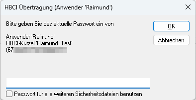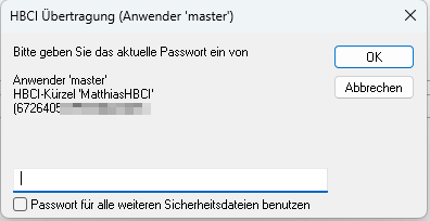 erst jetzt wird das HBCI-Passwort verlangt, also das Übertragungspasswort für den Auftrag!