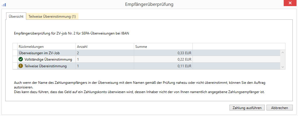 Profi cash zeigt die Ergebnisse der Namensprüfung. Es wird über Freigabe oder Ablehnung des gesamten Jobs entschieden. Soll gebucht werden, erfolgt die Datenübertragung der eigentlichen Aufträge und die Unterschriften für den Transfer.