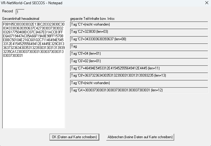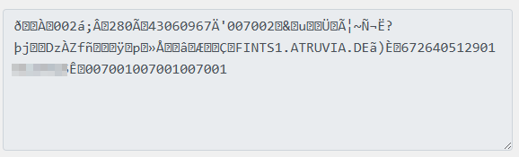 Mit einem online-Tool, welches HEX zu ASCII konvertiert, kann man einen Teil der Daten lesbarer machen, so sind z.B. die BLZ, URL des FinTS-Servers, die Benutzerkennung und die Kartenart/Folgenummer werden sichtbar.