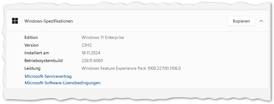 Die Versionsangaben finden Sie in der Rubrik Windows-Spezifikationen. Mit Klick auf Kopieren können Sie die Versionsangaben als „Text“ in die Zwischenablage übernehmen, falls Sie z.B. ein Formular ausfüllen müssen oder eine Mail senden möchten.